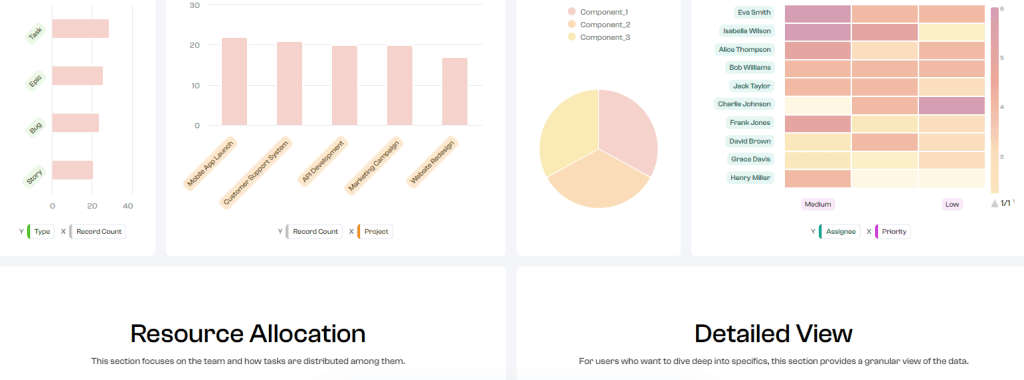 Using Google Looker Studio, you can create reports that track KPIs and custom metrics specific to your group or company. With the level of customization possible, you can zero in on the metrics relevant to your company, such as task time tracking, sprint velocity, or identifying bugs.