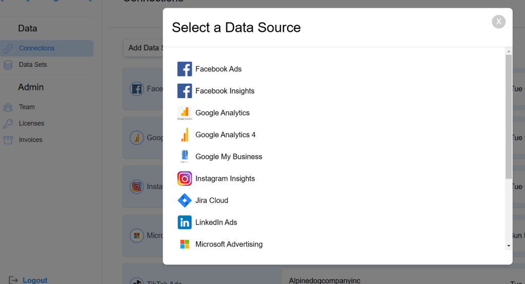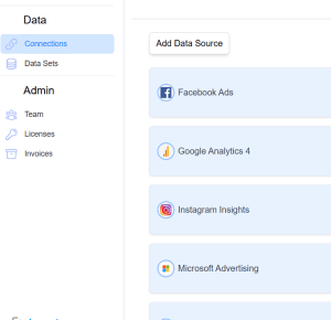 - Select the platform you wish to connect, such as Facebook Ads, Google Analytics, LinkedIn Ads, etc.