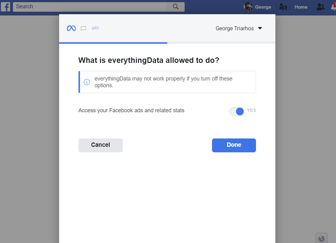 - When prompted, grant EverythingData permission to access your Facebook Ads data. Ensure the following permissions are selected: