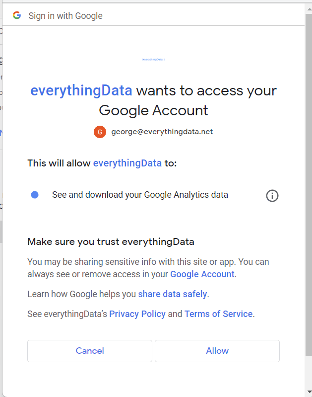 - When prompted, authorize EverythingData to access your GA4 data, allowing it to retrieve key metrics such as users, sessions, conversions, and engagement rates.