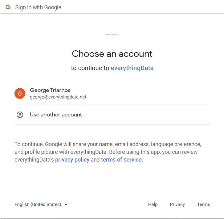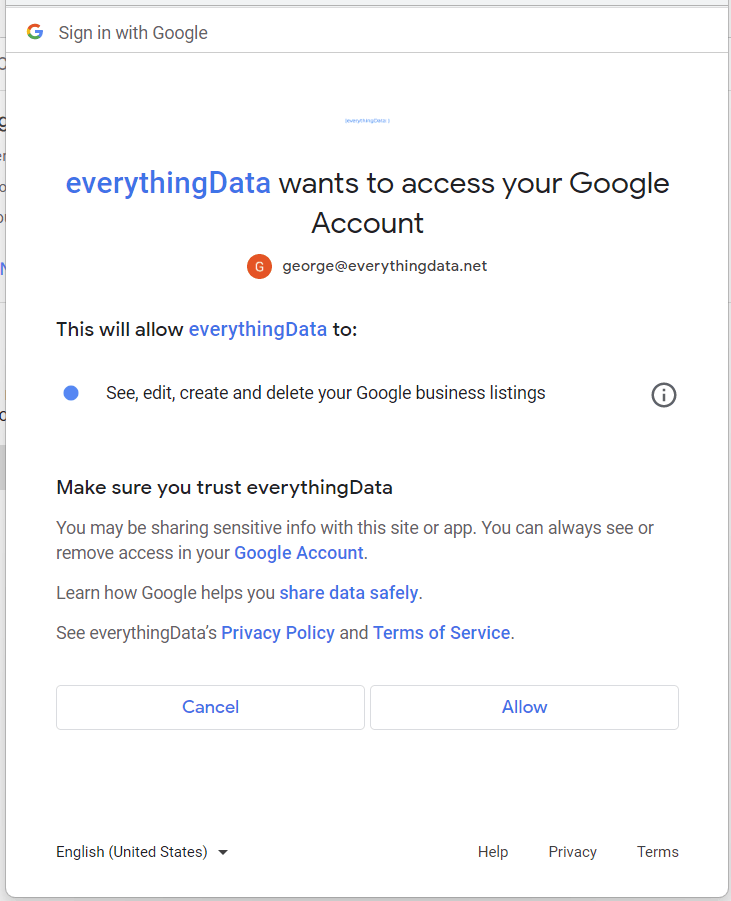 - When prompted, authorize EverythingData to access your GBP data. This authorization allows EverythingData to retrieve key metrics like searches, reviews, direction requests, and calls.