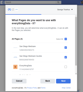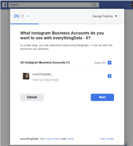 - Select the specific Instagram account(s) you want to connect to everythingData. This option is beneficial for users managing multiple accounts or brands, as it allows them to choose only relevant accounts for integration.