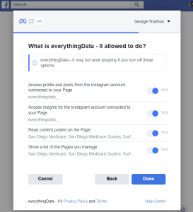 - When prompted, authorize everythingData to access your Instagram Insights data. This permission allows everythingData to retrieve key metrics such as reach, engagement, and demographics from your Instagram Business Account.