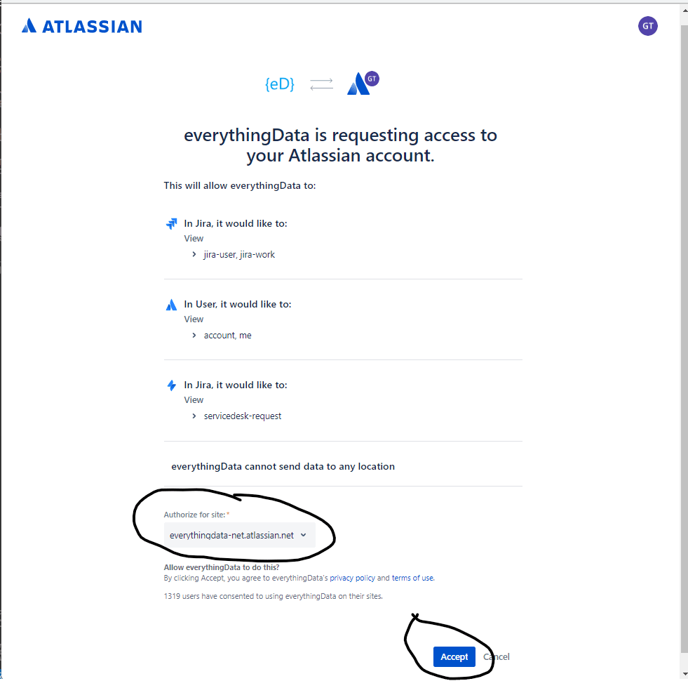 - When prompted, authorize EverythingData to access your Jira Cloud data, allowing it to retrieve metrics such as issue counts, workflow statuses, and team workload.
