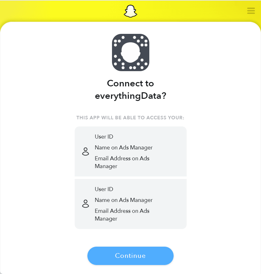 - Grant EverythingData permission to access your Snapchat Ads data, including metrics like impressions, clicks, swipe-ups, and conversions.