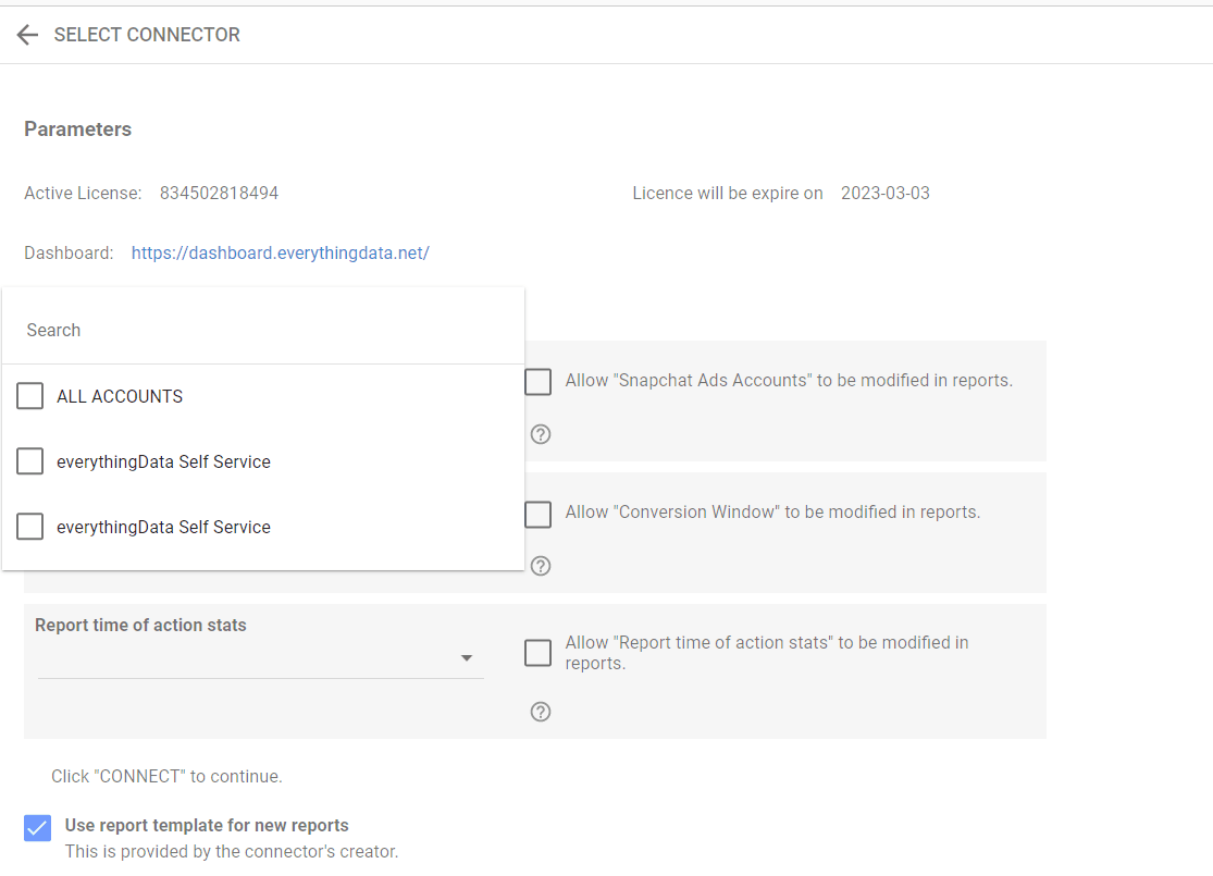 - Select the specific ad accounts you want to connect to EverythingData. This is particularly useful if you manage multiple Snapchat Ads accounts.