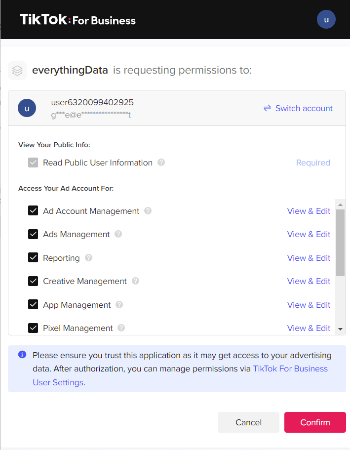 - Grant EverythingData the necessary permissions to access data from TikTok Ads, including metrics such as impressions, clicks, video views, and conversions.